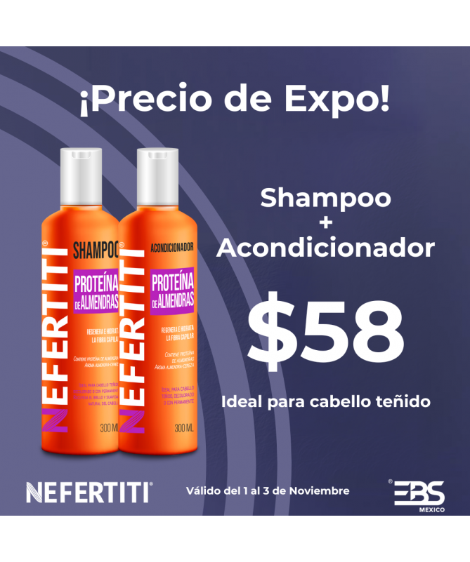 Duo Almendras: ¡Regenera e hidrata la fibra capilar! Shampoo y Acondicionador Proteína de Almendras de Nefertiti regeneran e hidratan la fibra capilar del cabello que ha sido sometido a un proceso químico. Contiene Proteína de Almendras que recuperan el brillo y suavidad natural.